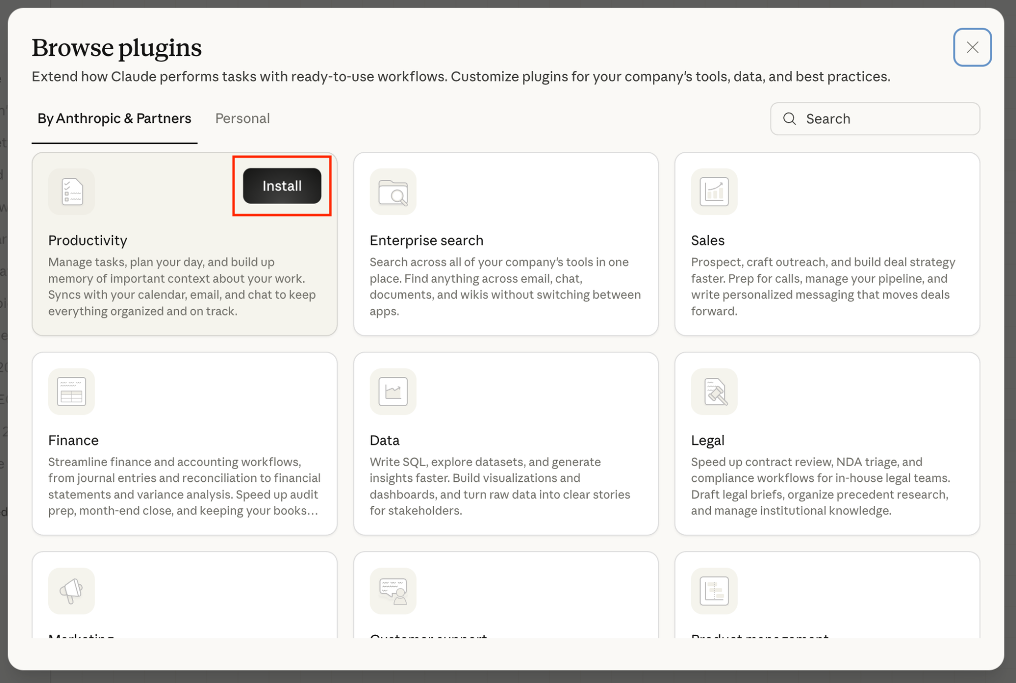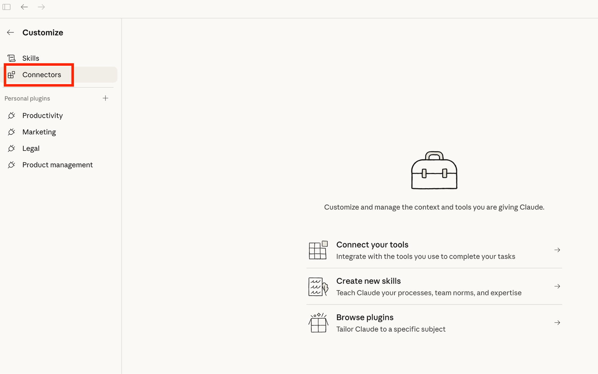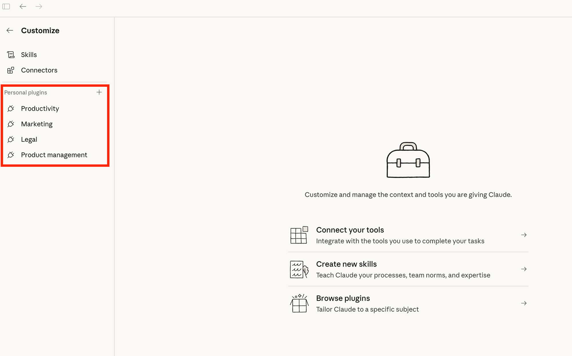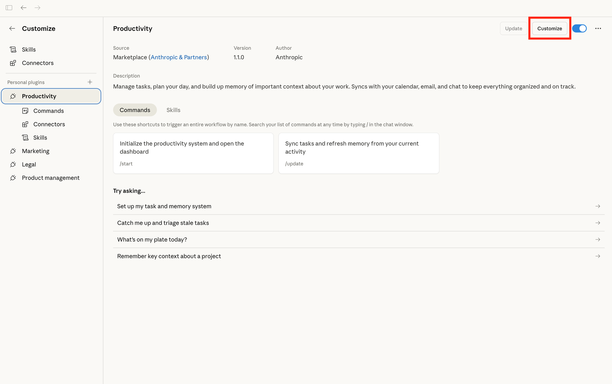 Click "Customize" on any installed plugin to adjust skills, commands, and connectors. The defaults are starting points. The real value comes from adding your company's context, terminology, and processes.