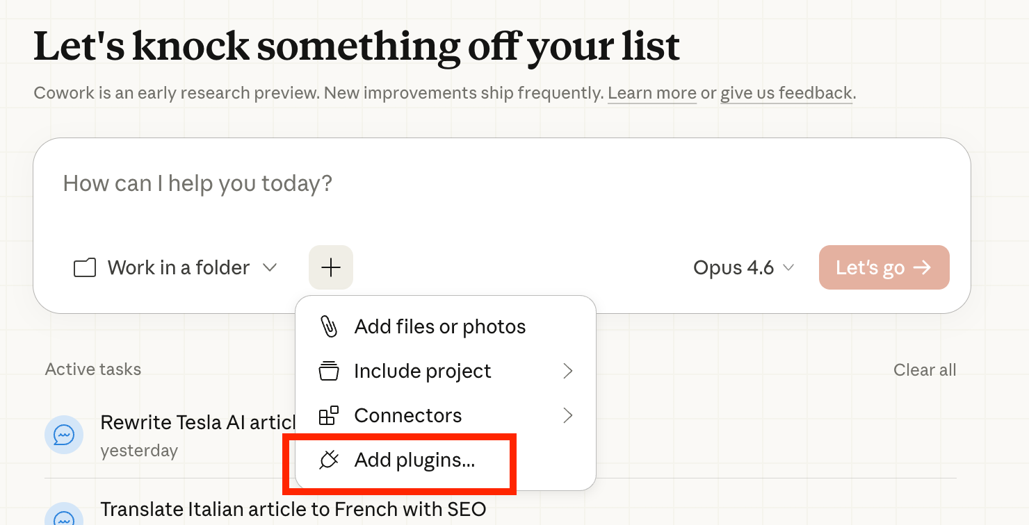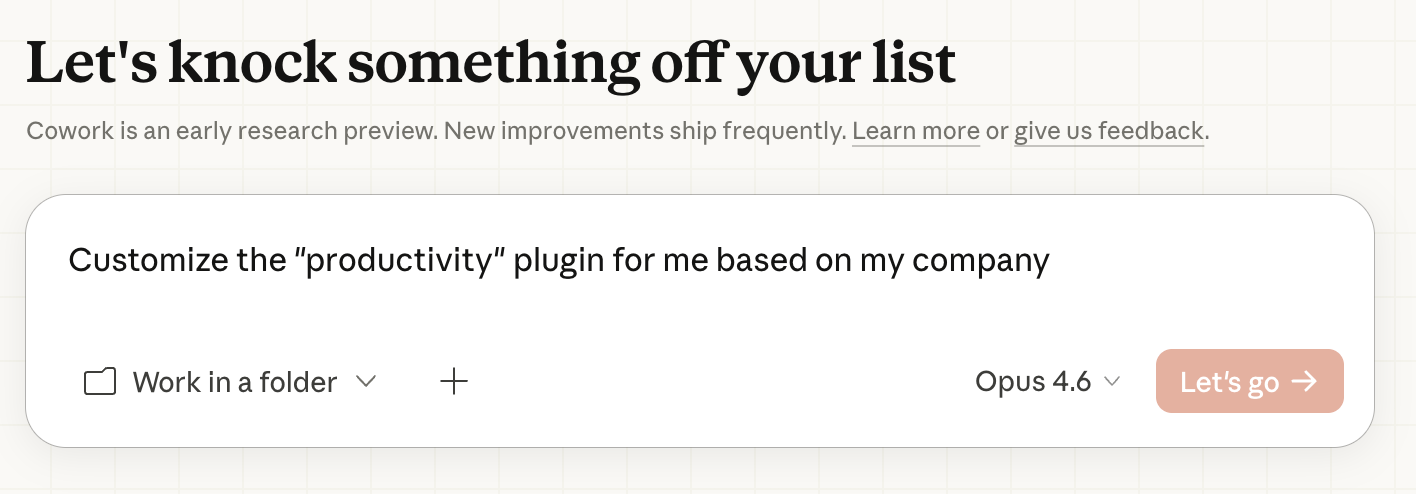 - A new chat window opens which invites you to tell Claude Cowork how you want to tweak your plugin. Then “Let’s go”!